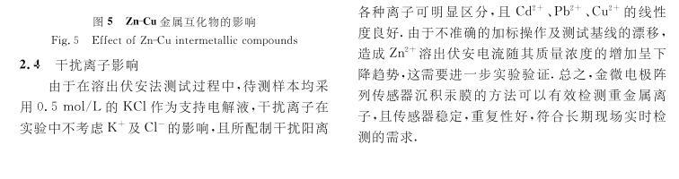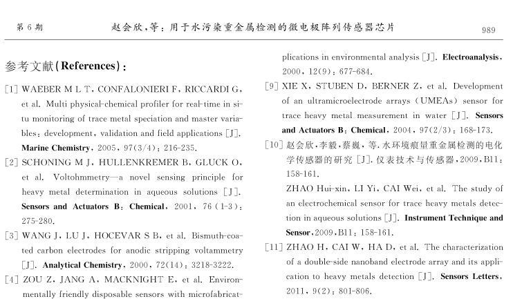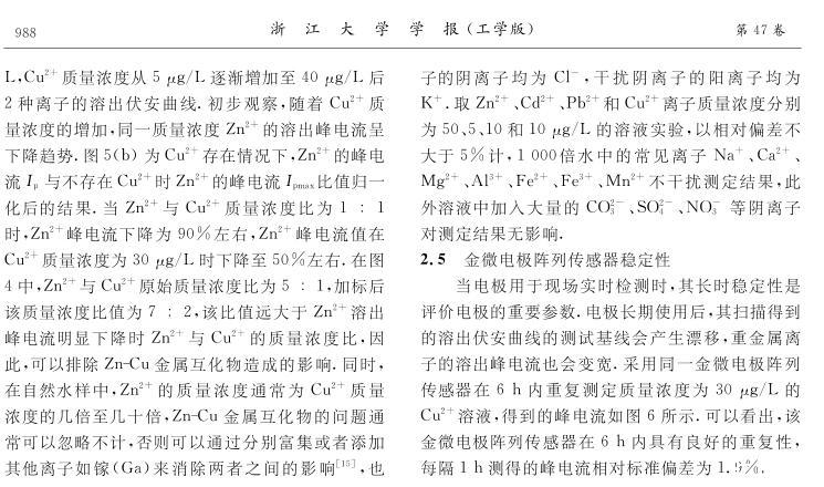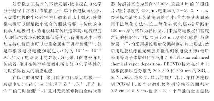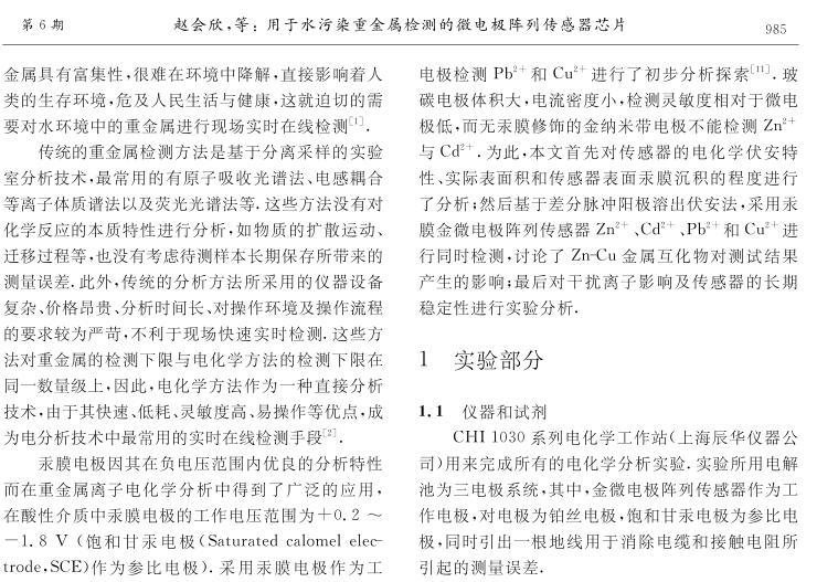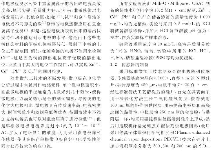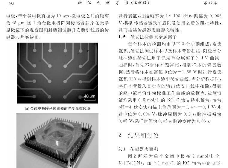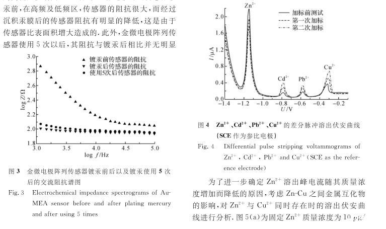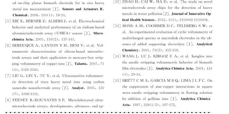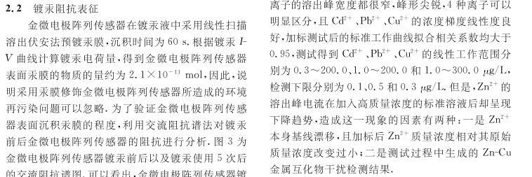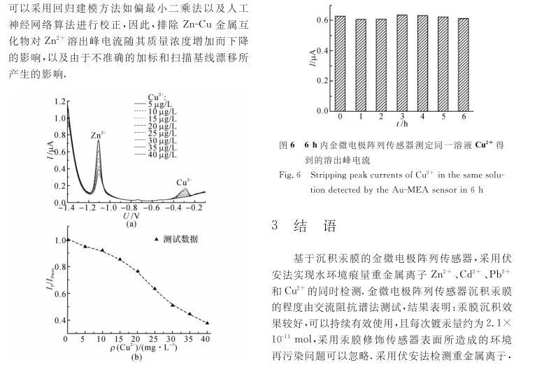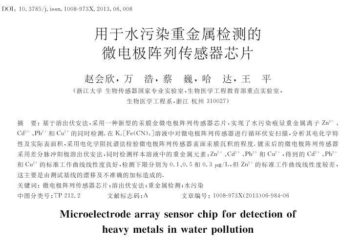 【摘要】:基于溶出伏安法,采用一種新型的汞膜金微電極陣列傳感器芯片,實(shí)現(xiàn)了水污染痕量重金屬離子Zn2+、Cd2+、Pb2+和Cu2+的同時(shí)檢測(cè).在K3[Fe(CN)6]溶液中對(duì)微電極陣列傳感器進(jìn)行循環(huán)伏安掃描,分析其電化學(xué)特性及實(shí)際表面積,采用電化學(xué)阻抗譜法檢驗(yàn)微電極陣列傳感器表面汞膜沉積的程度。鍍汞后的微電極陣列傳感器采用差分脈沖陽(yáng)極溶出伏安法,同時(shí)檢測(cè)樣本溶液中的重金屬元素:Zn2+、Cd2+、Pb2+和Cu2+,得到的Cd2+、Pb2+和Cu2+的標(biāo)準(zhǔn)工作曲線線性度良好,檢測(cè)下限分別為0.1、0.5和0.3μg/L,但Zn2+的標(biāo)準(zhǔn)工作曲線線性度較差,這主要是由測(cè)試基線的漂移及不準(zhǔn)確的加標(biāo)造成的。