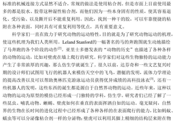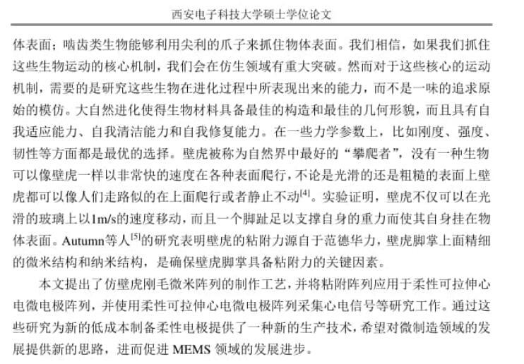 【摘要】:自然界中壁虎具有非常優(yōu)秀的吸附能力,可以自由行走在光滑的墻壁上,甚至是天花板上。壁虎腳掌的微米級剛毛結(jié)構(gòu)和納米級絨毛結(jié)構(gòu),是保證其產(chǎn)生巨大粘附力且能適應(yīng)不同表面形貌的關(guān)鍵。這種精細(xì)的結(jié)構(gòu)廣泛應(yīng)用于MEMS領(lǐng)域和各種機(jī)器人領(lǐng)域,本文中將壁虎的這種結(jié)構(gòu)應(yīng)用到生物醫(yī)學(xué)領(lǐng)域,把壁虎剛毛結(jié)構(gòu)應(yīng)用到柔性微傳感器上,使柔性微傳感器可以直接粘附在皮膚上直接測量生理信號。實驗中將柔性微傳感器和仿壁虎剛毛結(jié)構(gòu)結(jié)合在一起做了如下工作。仿壁虎剛毛纖維小柱陣列的制作方法有很多,本文采用兩種先進(jìn)的工藝方法來制作。
