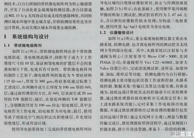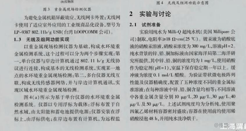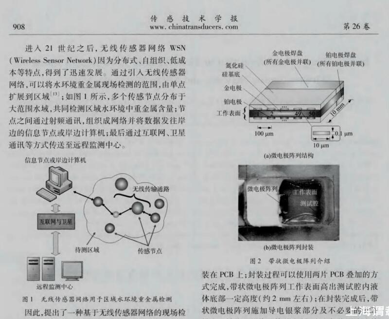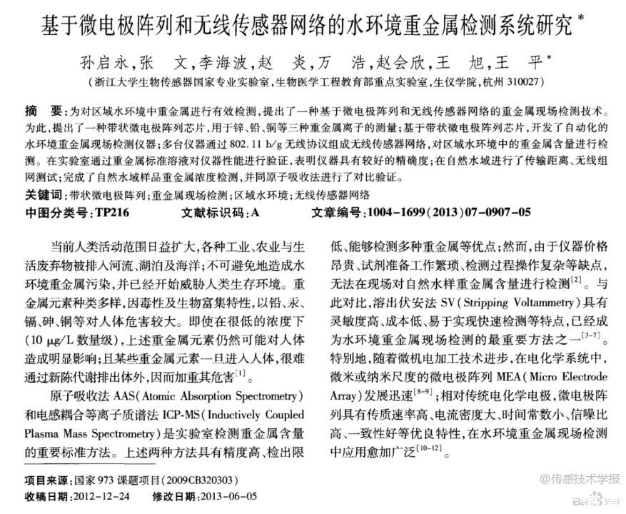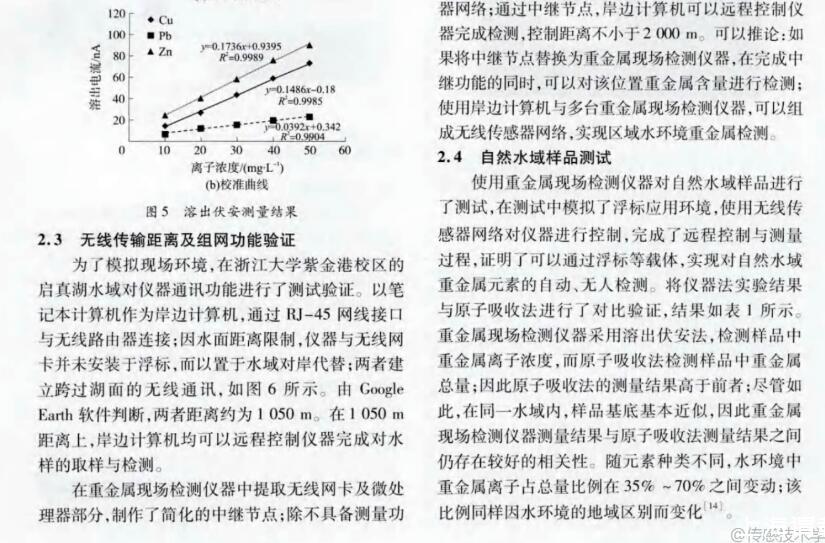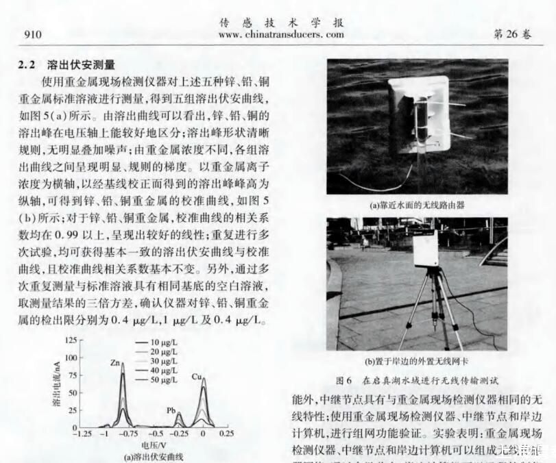 【摘要】:為對(duì)區(qū)域水環(huán)境中重金屬進(jìn)行有效檢測(cè),提出了一種基于微電極陣列和無線傳感器網(wǎng)絡(luò)的重金屬現(xiàn)場(chǎng)檢測(cè)技術(shù)。為此,提出了一種帶狀微電極陣列芯片,用于鋅、鉛、銅等三種重金屬離子的測(cè)量;基于帶狀微電極陣列芯片,開發(fā)了自動(dòng)化的水環(huán)境重金屬現(xiàn)場(chǎng)檢測(cè)儀器;多臺(tái)儀器通過802.11 b/g無線協(xié)議組成無線傳感器網(wǎng)絡(luò),對(duì)區(qū)域水環(huán)境中的重金屬含量進(jìn)行檢測(cè)。在實(shí)驗(yàn)室通過重金屬標(biāo)準(zhǔn)溶液對(duì)儀器性能進(jìn)行驗(yàn)證,表明儀器具有較好的精確度;在自然水域進(jìn)行了傳輸距離、無線組網(wǎng)測(cè)試;完成了自然水域樣品重金屬濃度檢測(cè),并同原子吸收法進(jìn)行了對(duì)比驗(yàn)證。