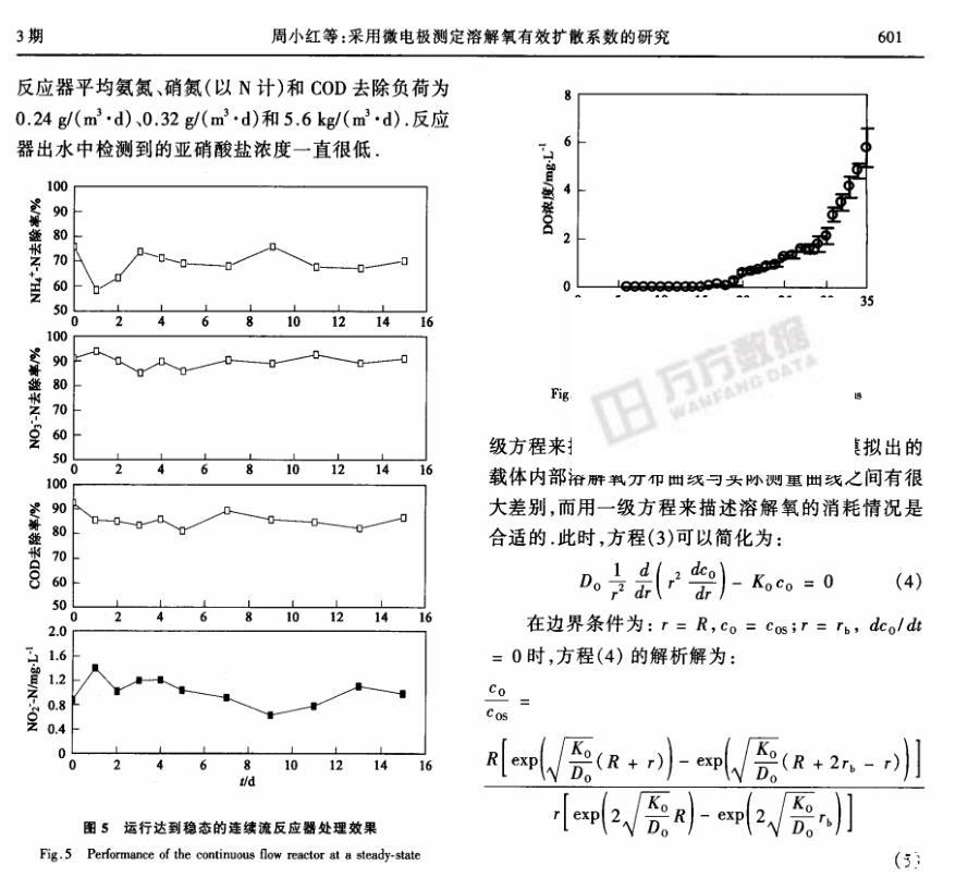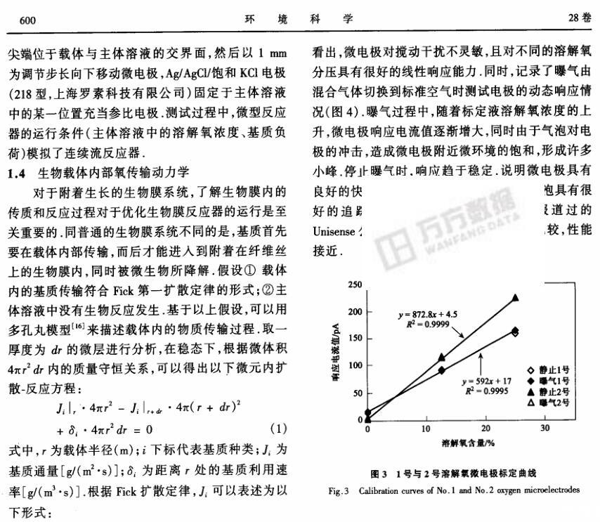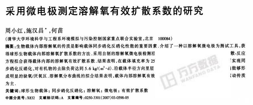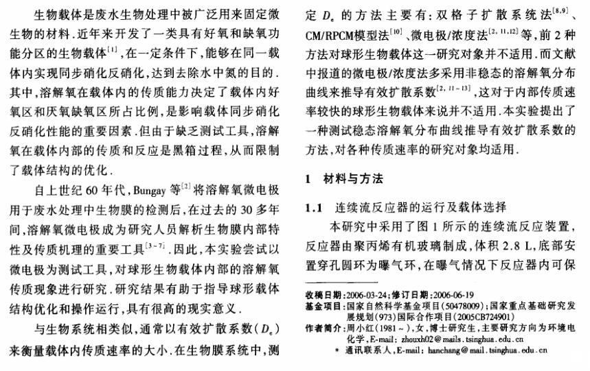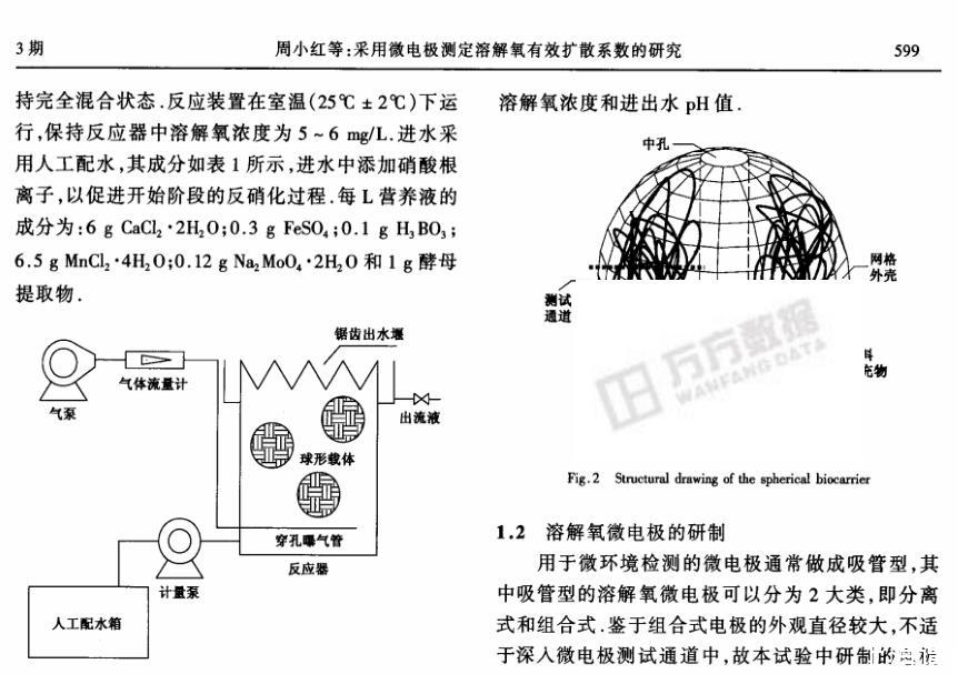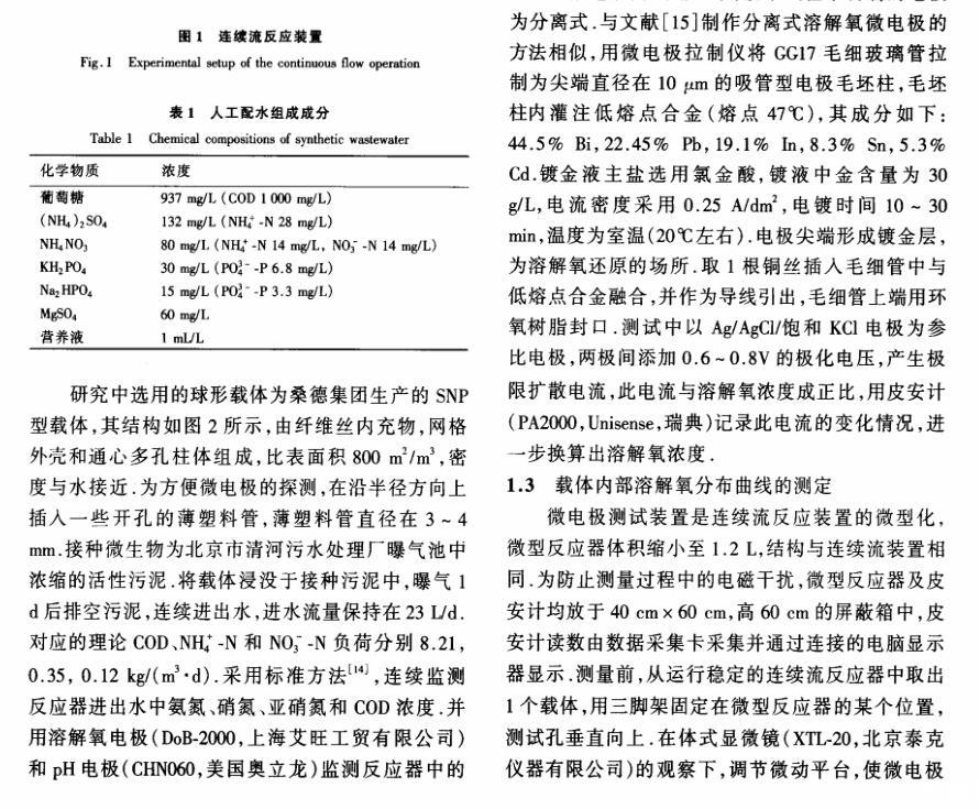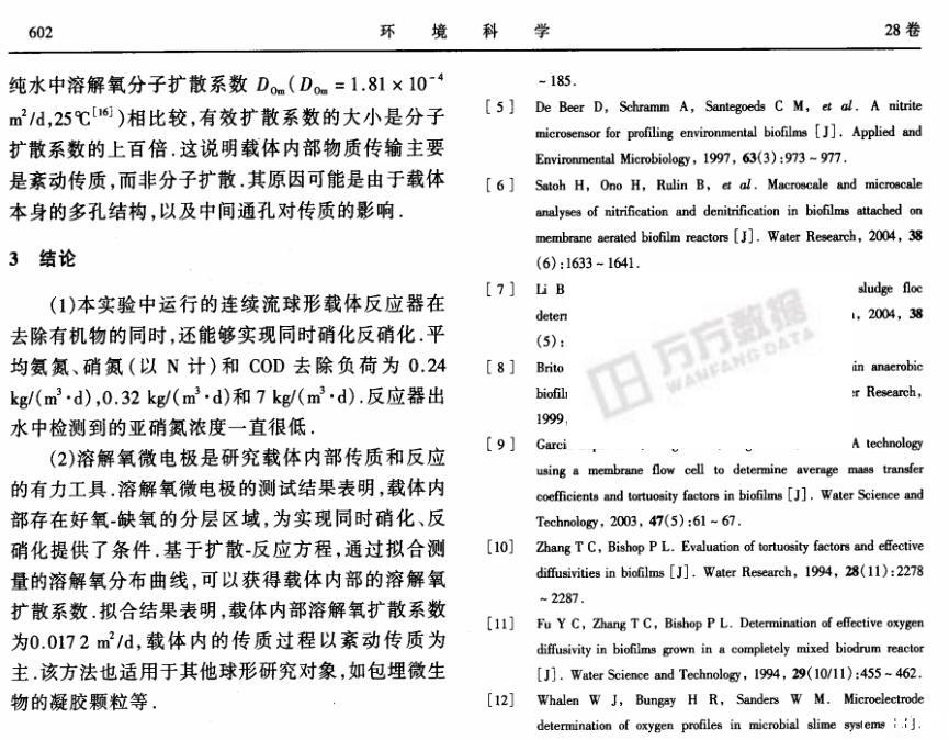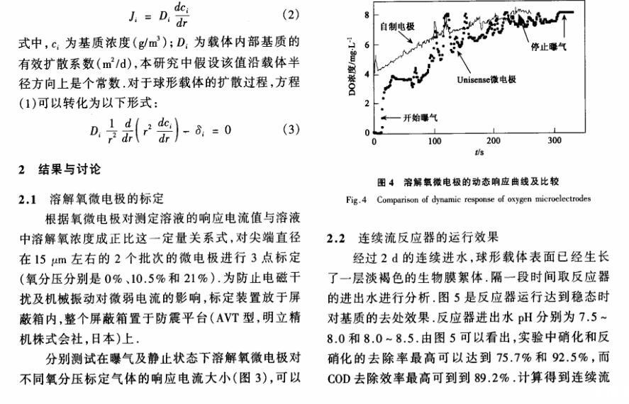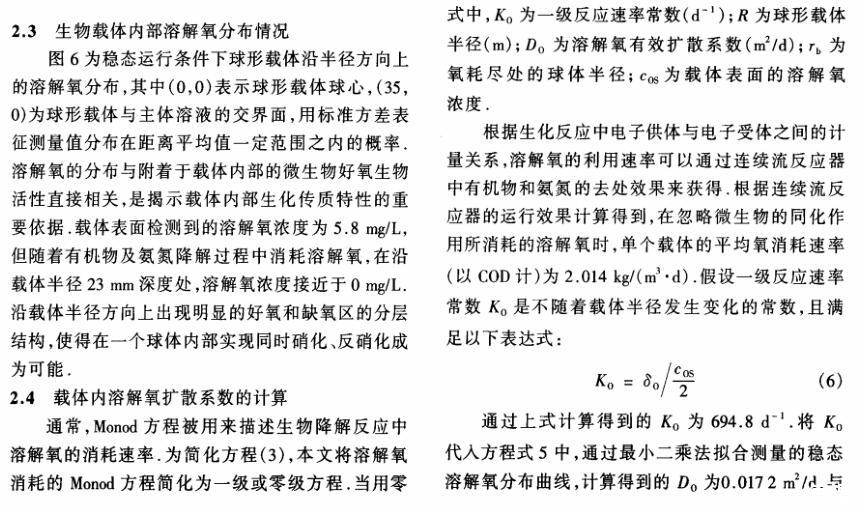 結果表明,在載體填充率為25%的情況下,連續流球形載體反應器可實現同步硝化反硝化,對有機物的去除負荷達到5.6kg/(m3.d)。沿載體半徑方向里層1/2區域范圍內溶解氧消耗為零,載體內能夠形成明顯的缺氧/厭氧區。溶解氧分布曲線的擬合結果表明,載體內部溶解氧有效擴散系數為0.0172m2/d,傳質過程以紊動傳質為主。