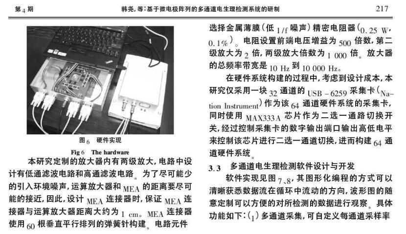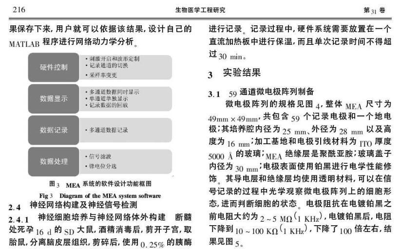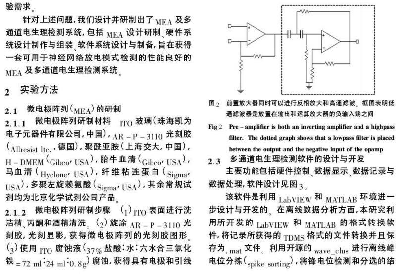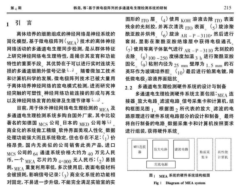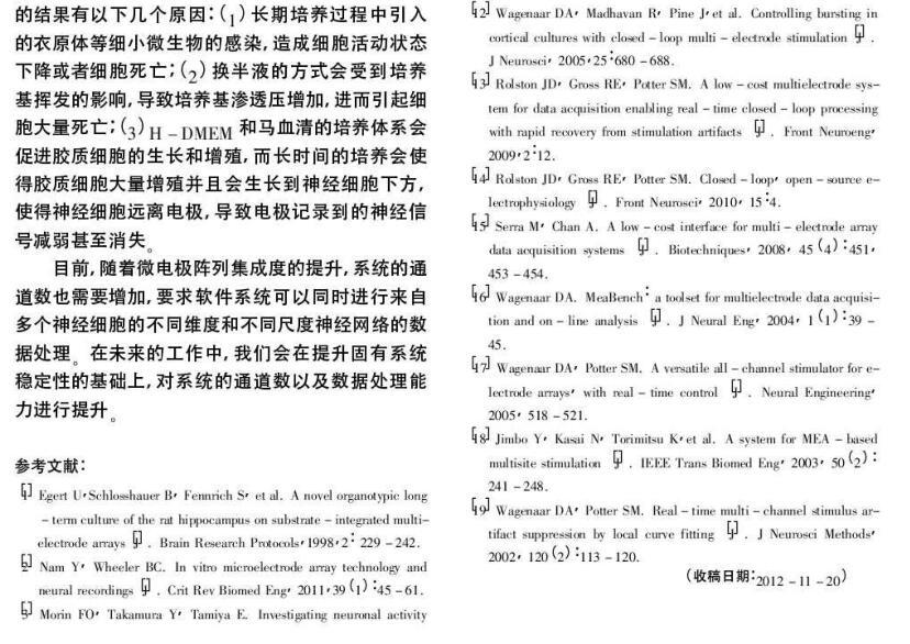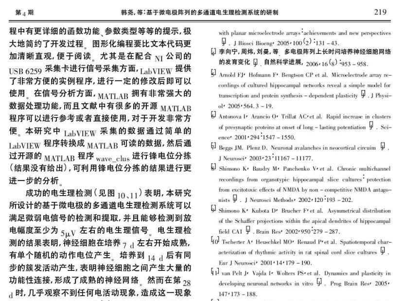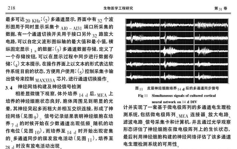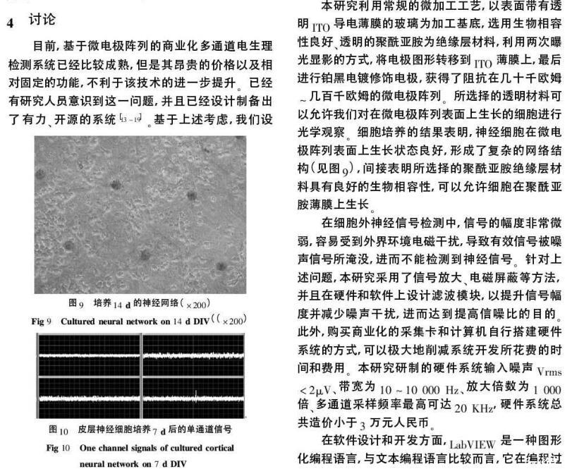 在labVIEW平臺下進行編程,滿足對數據采集卡的操作。我們成功制備了一套低成本的微電極陣列及相關檢測系統。該系統用于不同類型神經細胞組成的神經網絡自發放電檢測,可在體外培養的神經網絡中檢測到5μV的神經信號,并在神經網絡發育14 d檢測到密集的同步簇發動作電位。我們研發的微電極陣列及多通道電生理檢測系統具有良好的性能,可用于不同類型神經細胞的神經網絡微弱信號的檢測與神經網絡發育研究。
