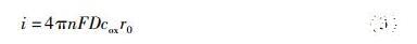 D為擴散系數,r為電極半徑。r越小,擴散速率越快。與此同時,當電極表面傳質速率快時,反應物向電極表面傳輸的過程中不受干擾。因此,可使用微電極研究速率較快的電化學反應[28]。基于上述微電極傳質規律可得到微電極的穩態擴散電流,公式如下: