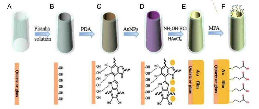 圖1金環微電極的制作步驟[12]。(A)拉制好的空玻璃毛細管;(B)毛細管內壁羥基化;(C)毛細管內壁自組裝上聚多巴胺層;(D)內壁生長金納米粒子;(E)形成金膜;(F)金環微電極尖端修飾3?巰基丙酸