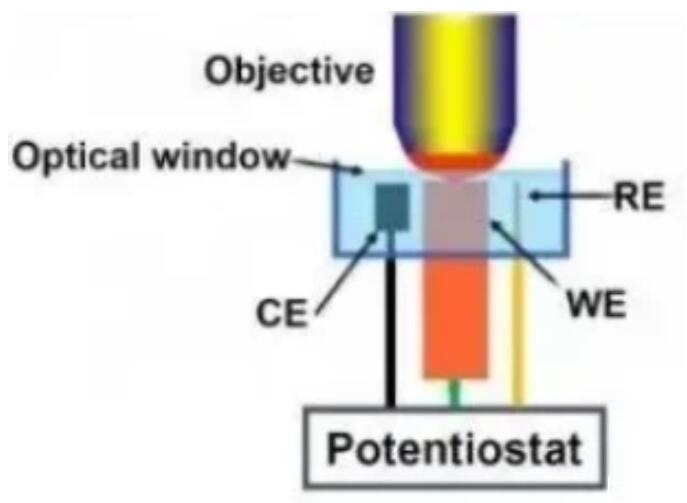 原位電化學拉曼光譜測量原理如如圖2所示,通常是在三電極的電化學裝置內進行,以該研究為例,使用銅樹突/GDL電極作為工作電極,泡沫鎳作為對電極,標準Hg/HgO電極作為參考電極,1 M KOH為電解液,陰離子交換膜分隔陰陽極。測試儀器使用Renishaw inVia顯微拉曼光譜儀進行光譜掃描,激發波長514 nm,激光強度2 mW,格柵1800 lines mm–1,焦距15 mm。測試時以恒定的C2H2氣流曝氣,使用CHI760E電化學工作站控制進行恒電勢控制,電勢范圍為:+0.2--0.4 V vs.RHE。