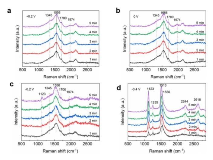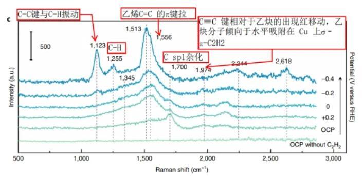 在電化學研究中,電化學拉曼光譜已經成為探究反應界面常用的技術方案之一。在該研究中,研究人員利用原位拉曼光譜觀測了不同電位、時間下的拉曼伸縮振動峰(圖三、四),首先是做了空白對照,在開路電位(OCP)未通入乙炔,沒有明顯的振動峰。隨著乙炔氣流的通入,出現了明顯的ν(C≡C)振動峰(1700 cm-1)以及σ–π-C2H2構造信號峰(1974 cm-1),這表明通入的乙炔氣體吸附在銅樹突的表面,而σ–π-C2H2峰的出現則說明乙炔是水平結合在銅樹突表面。隨著從OCP到+0.2V的電位的增加,乙炔的特征拉曼峰逐漸減小,生成了C=C拉伸峰(1556cm-1)和對稱的-CH2振動模式(1345cm-1),說明乙炔在銅樹突電極上逐漸反應,C≡C斷裂生成了吸附型的*C=C中間體。進一步隨著電勢逐漸負移(0–-0.4 V),出現了水平對置C=C振動峰(1,513cm-1),則表明生成了乙烯。電化學還原后拉曼光譜中還出現了C–H振動峰(1255 cm-1)、C–H與C–C振動重疊峰(1123 cm-1、2244cm–1)以及C=C振動峰與C–H混合峰(2618 cm–1)。此外,并沒有觀測到C–C的振動峰說明沒有過度加氫產物生成(乙烷)。