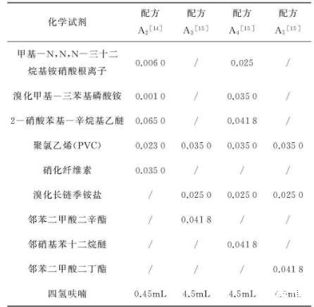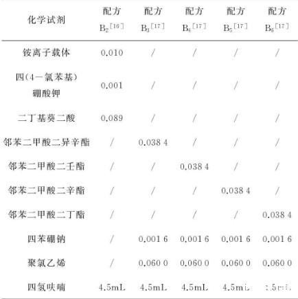 從已公開發表的文獻中選擇了5種硝酸根離子敏感劑配方和6種銨根離子敏感劑配方,分別用A1-A5和B1-B5表示。其中,配方A1為Nitrate ionophore I-cocktail A(Sigma-Aldrich,美國);配方B1為Ammonium ionophore I-cocktail A(Sigma-Aldrich,美國)。配方A2-A5組成如表1所示,配方B2-B6組成如表2所示。
