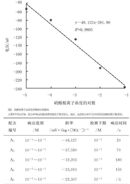 從表3中對比可得,配方A1制成的敏感膜性能優于其它配方。因此,選取配方A1作為本研究的硝酸根離子敏感劑。