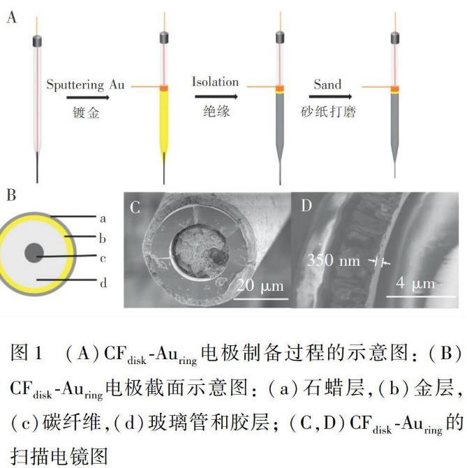 活體原位電化學分析是將微電極植入特定腦區,對腦神經系統內的物質進行分析的方法,因其為時空分辨率高,電極易于微型化、陣列化,在腦神經科學中的應用越來越多。但是腦內物質多樣,性質相近,多種物質分析必須克服相互之間的交叉干擾,因此建立具有高選擇性的多組分的原位實時電化學分析方法具有很大的挑戰。本研究設計了一個可同時檢測兩組分的微電極,如圖1所示,中間為碳纖維盤(CFdisk),外周為納米金環(Auring),以H2O2和DA為例,在CFdisk電極上修飾普魯士藍選擇性分析H2O2,Auring電極檢測DA。本研究結果有助于更深入研究腦神經系統中H2O2和DA的生理功能和二者的相互關系。