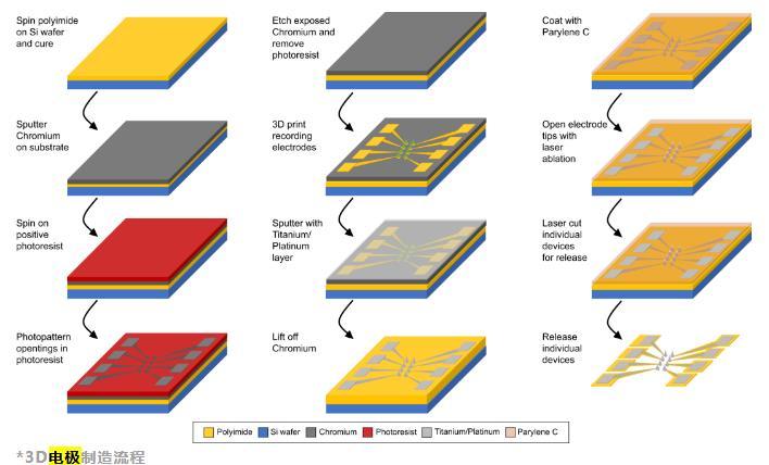 研究人員在硅襯底上制造了多孔電極用于刺激神經(jīng)元。使用金屬接觸焊盤(pán)和跡線(xiàn)直接在硅晶片上圖案化。然后用SU-8對(duì)跡線(xiàn)進(jìn)行絕緣,并涂覆鉻犧牲層。SU-8層和鉻層都被圖案化,為印刷品和接觸焊盤(pán)打開(kāi)窗口。電極結(jié)構(gòu)被3D打印、金屬化,然后鉻被蝕刻以去除不需要的金屬。