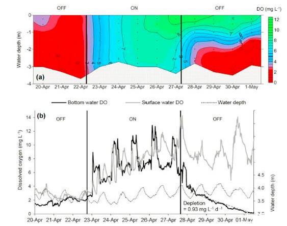 圖1、(a)溶解氧(DO)濃度(mg L?1)通過植物排放(CAV)上游190米的水柱(交叉)在不同深度處測量,在采樣日之間插值等高線。(b)用探針連續(xù)測量DO濃度(mg L?1),測量范圍為地表以下0.5m和河床以上0.5m(電廠排放上游120m)。水深(m)的增加或減少分別表示洪水和退潮。