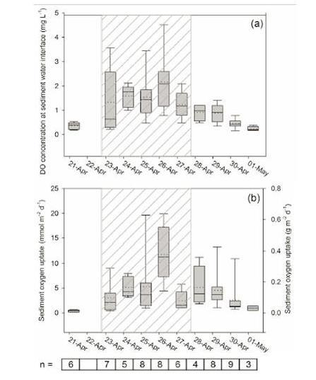 圖4、(a)沉積物-水界面溶解氧(DO)濃度(mg L?1)(b)向沉積物擴散的DO通量(mmol m?2d?1)。對于(a)和(b),方框表示第25和第75個百分位,平均值和中位數(shù)分別用虛線和實線表示,散列塊突出顯示工廠運行的時期。用于確定這兩個箱形圖的沉積物剖面的數(shù)量由與每個日期對齊的n值表示。