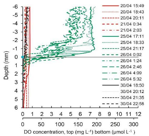 圖3、在裝置運作前兩天(4月20日至21日)、運作后三天(4月25日至26日)及運作后三天(4月30日),在沉積物-水界面上方6毫米及下方6毫米的原位溶解氧分布圖。