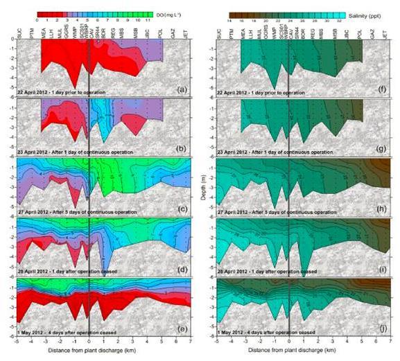 圖2、河口航道(下游約4.8公里,上游約6.7公里)溶解氧(mg L?1)和鹽度剖面。(a,f)工廠運營前一天(b,g)工廠運營一天后,(c,h)工廠運營五天后,(d,i)工廠運營停止后一天,(e,j)工廠運營停止后四天。