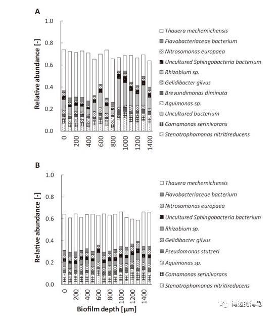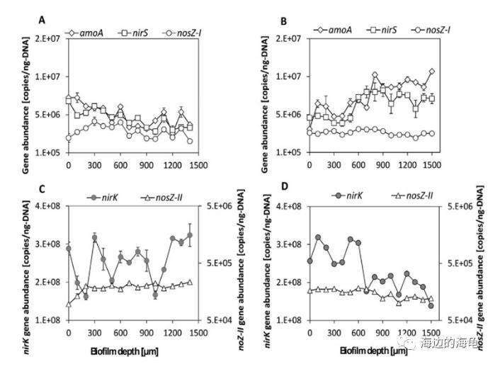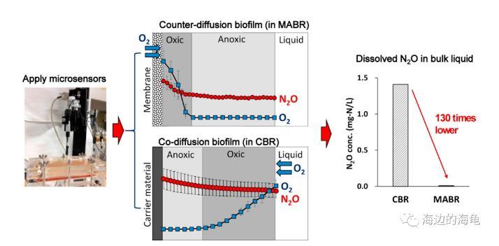 結(jié)論與展望:在本論文研究中,研究人員證明了SND的MABR可以減少N2O排放的概念。為此進(jìn)行了反應(yīng)器操作和原位生物膜深度研究此項(xiàng)研究揭示了(i)具有反擴(kuò)散生物膜幾何形狀的MABR是否允許比具有共擴(kuò)散生物膜幾何形狀的傳統(tǒng)生物膜反應(yīng)器(CBR)更低的N2O排放量;(ii)N2O還原菌豐度和活性的空間分布如何變化,在生物膜反擴(kuò)散生物膜中的微生物群落結(jié)構(gòu)是否不同取決于生物膜的深度。為了解決這些研究問題,研究人員將微電極技術(shù)(unisense)原位的測試出膜生物反應(yīng)器中生物膜中的氧氣及氧化亞氮的濃度,并與分子微生物學(xué)方法相結(jié)合。定量PCR和高通量測序技術(shù)16S rRNA基因擴(kuò)增,比較反擴(kuò)散和共擴(kuò)散生物膜。本研究是第一次直接比較MABR和CBR在整體和空間分解的N2O產(chǎn)量/減少和作為生物膜深度功能的微生物群落組成方面的結(jié)果。2種生物膜分別采用逆流和共流基質(zhì)擴(kuò)散結(jié)構(gòu),在相同負(fù)荷率下,對(duì)低DOC/TDN為1.0的高含氮廢水進(jìn)行同時(shí)硝化反硝化。上述研究結(jié)果證明了MABRs有望成為一種小足跡技術(shù),既能實(shí)現(xiàn)有效的同步硝化/反硝化,又能減緩N2O排放。