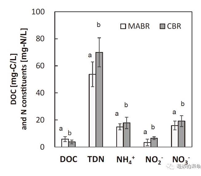 實(shí)驗(yàn)結(jié)果:研究表明MABR中的表面氮去除率(11.0±0.80 gN/(m 2天)略高于CBR(9.71±0.94 gN/(m 2天),而總有機(jī)碳去除效率相當(dāng)(MABR為96.9±1.0%,CBR為98.0±0.8%)。與此形成鮮明對(duì)比的是,MABR中溶解的N2O濃度(0.011±0.001 mg N 2 O-N/L)比CBR中的(1.38±0.25 mg N 2 ON/L)低兩個(gè)數(shù)量級(jí),導(dǎo)致明顯的N2O排放因子(MABR中的0.0058±0.0005%與CBR中的0.72±0.13%)。對(duì)當(dāng)?shù)貎鬘2O生產(chǎn)和消費(fèi)率的分析揭示了N2O區(qū)域的產(chǎn)生和消耗在MABR生物膜中是相鄰的。實(shí)時(shí)定量PCR表明MABR與CBR中反硝化基因的豐度更高,尤其是一氧化二氮還原酶(nosZ)基因。通過對(duì)16S rRNA基因擴(kuò)增子測序?qū)ξ⑸锶郝浣M成的分析顯示,Tauera屬(31.2±11%)、根瘤菌(10.9±6.6%)、狹養(yǎng)單胞菌(6.8±2.7%)、鞘氨醇桿菌(3.2±1.1%)存在豐富和Brevundimonas(2.5±1.0%)作為MABR中潛在的N2O還原細(xì)菌。