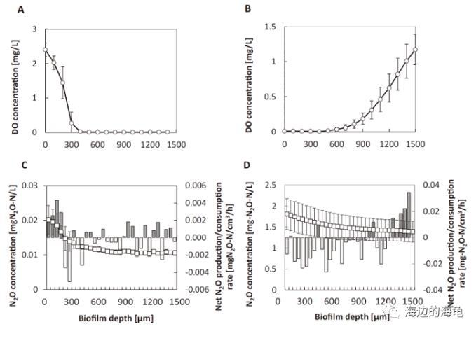 使用Clarktype微電極(Unisense,丹麥)測量整個(gè)生物膜深度內(nèi)溶解N2O和溶解氧(DO)濃度剖面,并連接皮安表(Unisense,奧爾胡斯,丹麥)進(jìn)行數(shù)據(jù)采集。氧氣微電極和N2O微電極的尖端直徑分別為50um和25um。在使用微電極測試生物膜之前,對(duì)每個(gè)微電極進(jìn)行了校準(zhǔn)。微操作器和微電極使用Sensor Trace Pro軟件精確控制微電極插入生物膜的位置(Unisense,丹麥)。在反應(yīng)器運(yùn)行的第90天和第95天,在插入微電極的中間端口的10-15個(gè)點(diǎn),獲得了N2O和O2濃度的生物膜深度分布。在假定穩(wěn)態(tài)條件下,利用菲克第二擴(kuò)散定律,估算了各濃度分布下的平均N2O凈容量消耗/生產(chǎn)速率。