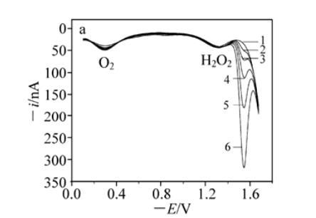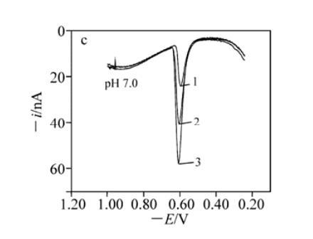 上圖是在溶解氧濃度為210微摩的海水中產(chǎn)生的方波伏安圖。氧在-0.28 V電位下被還原成過氧化物,過氧化物在-1.22 V電位下被進(jìn)一步還原成水。兩個峰值電流的高度大致相等,這是汞金微電極在海水電解質(zhì)中工作的特征。對稱的雙峰也表明了高質(zhì)量的Hg-Au微電極