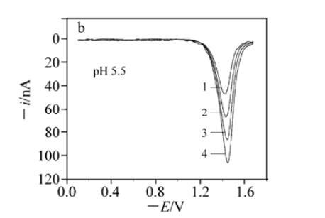 上圖顯示了海水中不同F(xiàn)e2+濃度的方波伏安圖。由于Fe2+離子在中性海水中容易水解,通過加入0.10 M HCl將標(biāo)準(zhǔn)溶液的pH調(diào)整為5.5。較低的pH值會產(chǎn)生不良的質(zhì)子干擾信號。結(jié)果表明,F(xiàn)e2+的Ep值為-1.43 V。還原電流與Fe2+濃度成正比,線性回歸方程為y=0.222x-1.2,回歸系數(shù)r=0.9994。Fe2+的檢出限為5.0μM