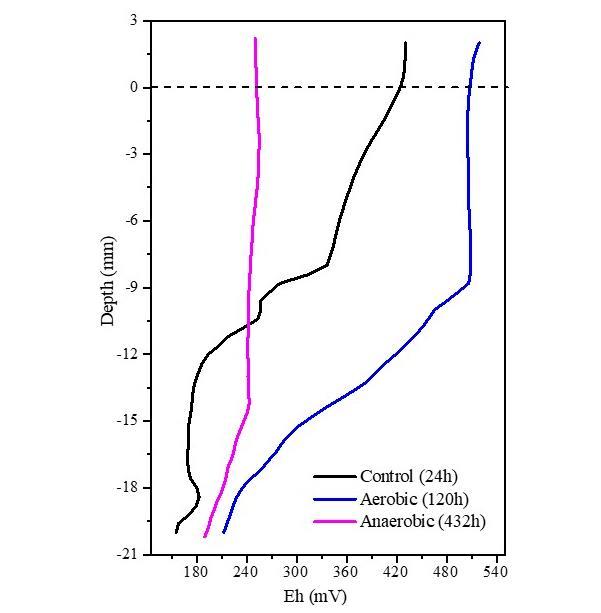 圖1、好氧和厭氧處理條件下沉積物-水剖面Eh的垂直變化