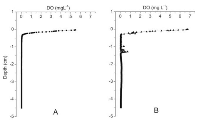 圖1、INT位置(A)和FW位置(B)孔隙水中的原位孔隙水DO剖面。在INT和FW區域,DO隨深度分別為5.6 mg L-1和6.8 mg L-1,下降到滲透深度約0.3 cm,此時DO水平接近于零。結果表明,0.3 cm以下的沉積物均為缺氧(孔隙水中沒有足夠的游離