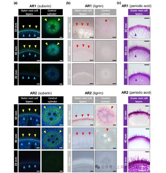 圖5、在水稻中,AR2構成了氣體擴散屏障,而AR1不構成氣體擴散屏障。(a)在距離根尖的距離處顯示AR1或AR2的木栓體染色。由黃色箭頭所示的黃-綠顏色可見墊層片層。藍色箭頭指向細胞壁自動熒光。(b)AR1或AR2的木質素染色可見粉紅色,并用紅色箭頭表示。棒材,20μm。(c)在AR1中酸通過外質體發生周期性擴散,但在AR2中沒有。紫色箭頭表示檢測到周期性酸的皮層細胞層。棒材,50μm。AR=不定根。