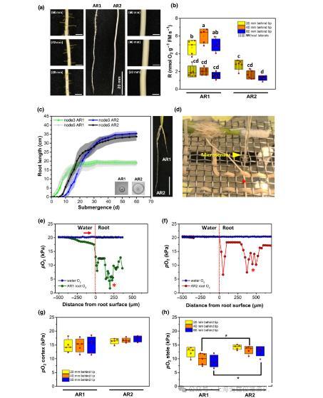 圖4、水稻AR1和AR2供氧量和呼吸速率的比較(a)AR1發育側根,AR2不發育側根。(b)在距離根尖不同距離處測定未(去除側根)或有側根(原始狀態)的AR1和未在這些位置形成側根的AR2的呼吸速率。從浸入水中的NIL-12植物的8-10厘米長的根中收集根尖(50-70毫米)處20毫米(10-30毫米)、40毫米(30-50毫米)和60毫米的根段。對不同根類型和位置的呼吸速率進行對數轉換數據的單因素方差分析和Tukey檢驗AR1在所有位置n=5,AR2在距離根尖20和40 mm,位置n=6,距離根尖60 mm位置n=5。(c)連續測定第3和第5年輕節點(節點3和5)的AR1和AR2的平均長度。淹沒60天后,AR1和AR2在NIL-12的節點5生長。(d)一個固定的AR浸泡在水中,用距離尖端60毫米處的微傳感器測量氧氣(紅星)。AR連接的桿的切割端用硅膠管和小玻璃珠密封。為了使氧氣能夠通過閥桿擴散供應,硅管被刺穿,并與氣罐上方的空氣接觸,同時防止坑腔被淹沒。大量的水被空氣輕輕凈化,以保持氧張力接近大氣平衡,并維持穩定的擴散邊界層。(e,f)距離AR1(e)或AR2(f)尖端60mm處的徑向氧分布。紅色箭頭表示氧氣從水中擴散到根部。紅色星號表示中央石碑。(g,h)中位皮層(g)或中柱(h)pO2,由每種根類型的n=5個徑向O2剖面計算,描繪為盒狀須狀圖,顯示平均值(+)、中位值(水平線)、50%四分位數(盒)、最小值和最大值(柱),圓圈表示單個數據點。根類型和位置之間的統計比較采用雙向方差分析Tukey測試顯示,AR1和AR2在距離尖端40和60 mm處的中柱O2有顯著差異。AR-不定根;NIL-近等基因系。