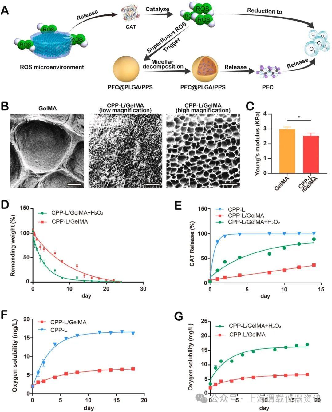 圖2、復(fù)合水凝膠的表征。(A)CPP-L/GelMA水凝膠清除ROS和智能供氧的示意圖。(B)GelMA水凝膠和CPP-L/GelMA水凝膠的代表性SEM圖像。(C)水凝膠的楊氏模量(n=3)。(D)CPP-L/GelMA水凝膠在不同條件下的降解(n=3)。(E)不同條件下CPP-L/GelMA水凝膠中CAT的釋放(n=3)。(F)CPP-L/GelMA水凝膠的氧氣釋放速率(n=3)。(G)不同條件下CPP-L/GelMA水凝膠的氧氣釋放率(n=3)。比例尺:B中GelMA和低放大倍數(shù)CPP-L/GelMA為20μm,B中CPP-L/GelMA高放大倍數(shù)為10μm。