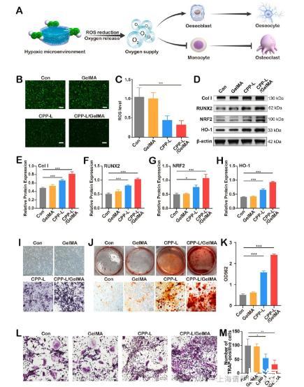 圖3、CPP-L/GelMA水凝膠對(duì)體外成骨細(xì)胞和破骨細(xì)胞的影響。(A)CPP-L/GelMA水凝膠促進(jìn)成骨細(xì)胞分化同時(shí)抑制破骨細(xì)胞形成的示意圖。(B)用不同制劑處理的MC3T3-E1細(xì)胞中ROS熒光染色的代表性圖像。(C)ROS熒光染色的定量分析(n=3)。(D)不同處理下MC3T3-E1分化成骨細(xì)胞的Col I、OPN、RUNX2、NRF2、HO-1和β-肌動(dòng)蛋白水平的蛋白質(zhì)印跡。(E-H)不同處理的MC3T3-E1分化成骨細(xì)胞中相對(duì)Col I(E)、RUNX2(F)、NRF2(G)和HO-1(H)的定量分析(n=3)。(I)不同處理下MC3T3-E1分化成骨細(xì)胞的ALP染色的代表性圖像。(J)不同處理下MC3T3-E1分化成骨細(xì)胞的茜素紅染色的代表性圖像。(K)茜素紅染色的定量結(jié)果(n=3)。(L)不同處理下RAW 246.7分化破骨細(xì)胞的TRAP染色的代表性圖像。(M)TRAP陽(yáng)性細(xì)胞數(shù)量統(tǒng)計(jì)(n=3)。比例尺:B、I、J和L為100μm。