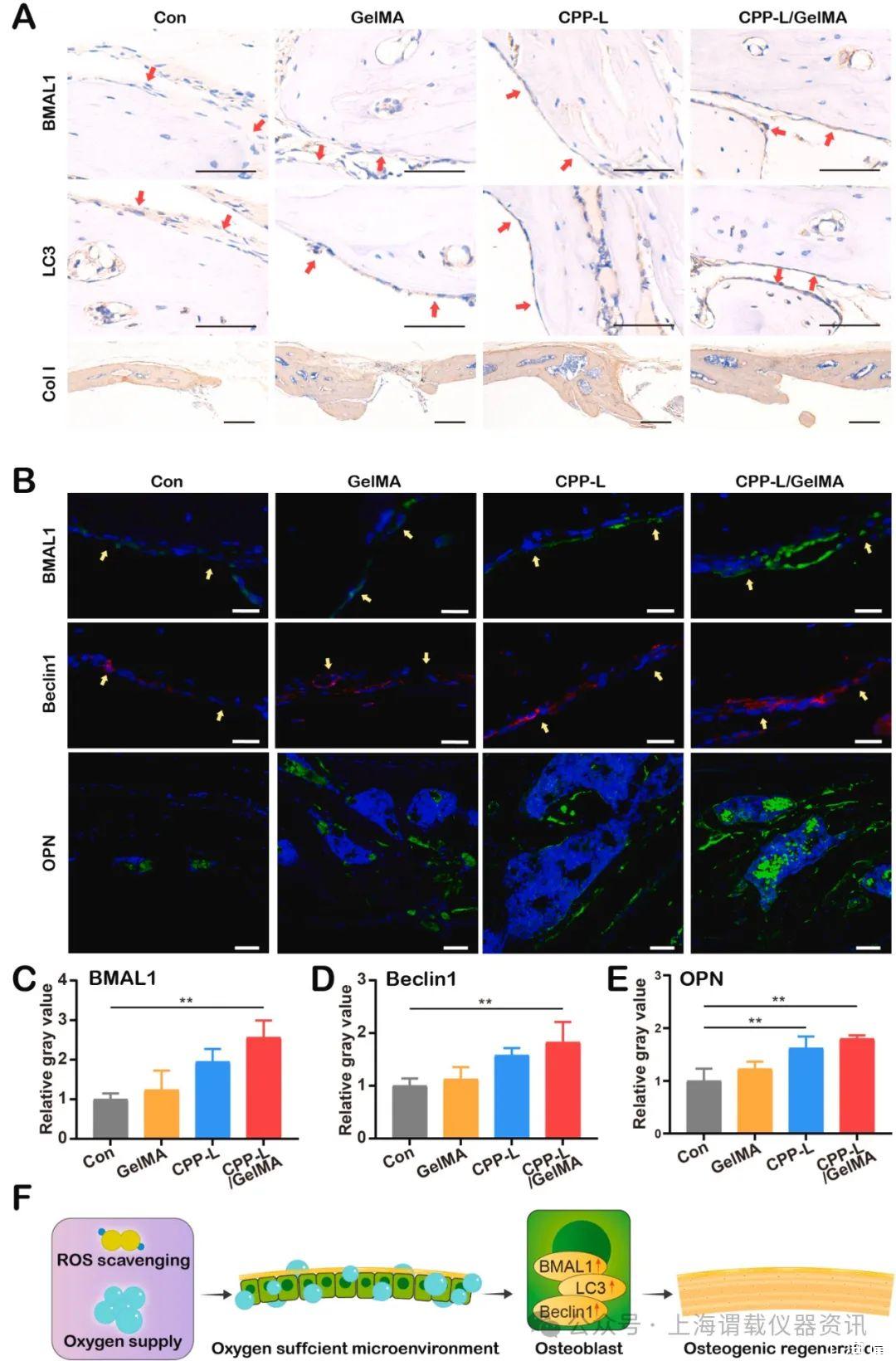 圖5、CPP-L/GelMA水凝膠通過(guò)上調(diào)BMAL1和自噬促進(jìn)體內(nèi)成骨。(A)8周時(shí)不同治療后小鼠顱骨缺損區(qū)域的BMAL1、LC3和Col I免疫組織化學(xué)染色的代表性圖像(紅色箭頭指向成骨細(xì)胞所在的骨膜)。(B)8周時(shí)不同治療后小鼠顱骨缺損區(qū)域的BMAL1、Beclin1和OPN免疫熒光染色的代表性圖像(黃色箭頭指向成骨細(xì)胞所在的骨膜)。(C-E)對(duì)不同治療后小鼠顱骨缺損區(qū)域的BMAL1(C)、Beclin1(D)和OPN(E)免疫熒光染色進(jìn)行定量分析(n=3)。(F)顱骨缺損區(qū)缺氧微環(huán)境中ROS清除和供氧通過(guò)激活BMAL1-自噬途徑促進(jìn)成骨再生的示意圖體內(nèi)。比例尺:A中的BMAL1和LC3為50μm,B中的OPN;A中的Col I為200μm;B中的BMAL1和beclin1為20μm。