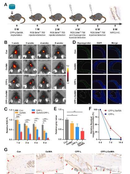 圖4、CPP-L/GelMA水凝膠可以緩解體內(nèi)骨缺損部位的缺氧并清除ROS。(A)治療監(jiān)測(cè)時(shí)間線(xiàn)示意圖。(B)體內(nèi)代表性圖像注射ROS Brite?700后不同時(shí)間點(diǎn)的成像系統(tǒng)。(C)ROS Brite?700的定量分析(n=6)。(D)注射Hypoxyprobe后4周時(shí)顱骨缺損區(qū)域的代表性熒光圖像。(E)Hypoxyprobe染色的定量分析(n=3)。(F)植入的CPP-L或CPP-L/GelMA中的相對(duì)殘余氧濃度。(G)8周不同治療后小鼠顱骨缺損區(qū)域NRF2的代表性免疫組織化學(xué)染色圖像(紅色箭頭指向成骨細(xì)胞所在的骨膜)。比例尺:C為200μm,F(xiàn)為50μm。