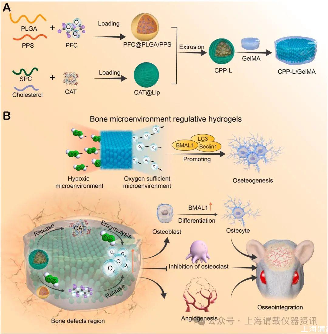 圖1、具有清除活性氧和延長(zhǎng)產(chǎn)氧作用以增強(qiáng)骨修復(fù)的骨微環(huán)境調(diào)節(jié)水凝膠的示意圖。(A)將PFC負(fù)載到PLGA/PPS納米顆粒中形成PFC PLGA/PPS納米顆粒。采用脂質(zhì)體共負(fù)載PFC PLGA/PPS納米粒子和CAT構(gòu)建CPP-L,將其進(jìn)一步封裝在GelMA水凝膠中,最終構(gòu)建CPP-L/GelMA智能響應(yīng)釋氧水凝膠。(B)CPP-L/GelMA可以作為“骨微環(huán)境調(diào)節(jié)水凝膠”來(lái)逆轉(zhuǎn)骨缺損區(qū)域的缺氧微環(huán)境,促進(jìn)成骨。CPP-L/GelMA植入骨缺損部位后,通過(guò)酶水解釋放CAT,產(chǎn)生氧氣缺氧微環(huán)境引起的ROS的產(chǎn)生。此外多余的ROS會(huì)觸發(fā)PFC PLGA/PPS納米顆粒釋放氧氣,然后氧氣破裂脂質(zhì)體并分散到周?chē)h(huán)境中以進(jìn)一步供氧。ROS清除和氧氣產(chǎn)生通過(guò)BMAL1自噬途徑促進(jìn)成骨細(xì)胞分化,抑制破骨細(xì)胞形成,并促進(jìn)新生血管形成,最終加速骨再生。