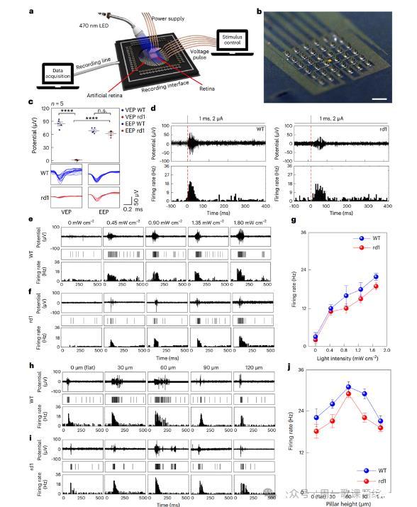 隨后,作者使用野生型(WT)和rd1小鼠的視網(wǎng)膜探究了該器件的體外電生理作用,包括光、電刺激和電極的影響。先是記錄了它們的視網(wǎng)膜在3D LM微電極上通過視覺或者電誘發(fā)時的反應(yīng),每個記錄電極與每個刺激電極相鄰放置(圖3a-3b)。將來自WT和rd1小鼠的分離的視網(wǎng)膜放置在該設(shè)備上,3D LM微電極朝向視網(wǎng)膜的RGC側(cè)。通過在沒有設(shè)備操作的光照下記錄了它們的視覺誘發(fā)電位(VEPs),而電誘發(fā)電位(EEPs)在黑暗狀態(tài)下利用設(shè)備操作時進行記錄。此外,由于小鼠是只有兩種視錐細胞類型的兩色哺乳動物(對藍光和綠光敏感),因此視覺誘發(fā)使用470 nm的藍光。結(jié)果顯示光線沒有在rd1小鼠視網(wǎng)膜內(nèi)引起視網(wǎng)膜反應(yīng)(圖3c)。而在電誘發(fā)實驗中,兩種小鼠的視網(wǎng)膜均出現(xiàn)可比EEP量級的RGC尖峰,而且rd1小鼠比WT型放電活動更早、增強更明顯(圖3d)。已知rd1小鼠視網(wǎng)膜的形態(tài)學(xué)變化,包括RGC大小和內(nèi)核層厚度的減少,會影響RGCs的功能特性,導(dǎo)致刺激閾值增加和潛伏期延長。接著作者分別使用平面型電極和具有不同高度的3D LM微電極在不同強度的光照下對兩種視網(wǎng)膜進行設(shè)備操作時誘發(fā)EEP(圖3e-3i),結(jié)果顯示在平面型電極上誘發(fā)的RGC荊波放電率和光強度成比例增加(圖3g)。與rd1情況相比,由于正常感光層的天然反應(yīng),WT小鼠視網(wǎng)膜顯示出更高的放電率。而盡管柱狀微電極具有與高度無關(guān)的電化學(xué)特征,但柱狀結(jié)構(gòu)電極在電刺激過程中增加了RGCs的放電活動(圖3j)。且當高度超過90μm時射速再次下降。這可能是由于刺激尖端穿過目標RGCs時誤將RGCs作為目標造成的。