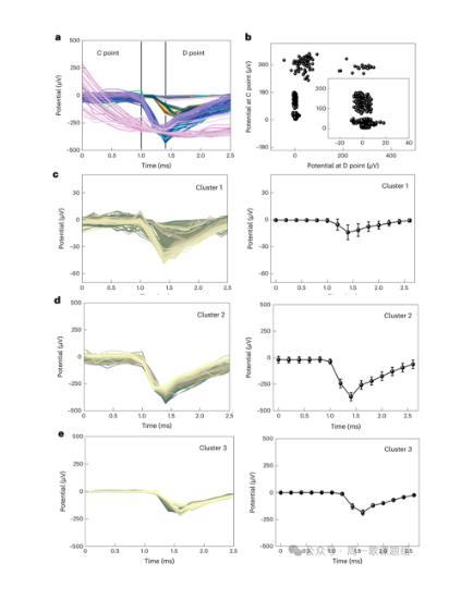 考慮到視網(wǎng)膜活動的復(fù)雜性,作者利用無監(jiān)督機器學(xué)習(xí)進行信號處理。根據(jù)信號的大小和形狀,給定的數(shù)據(jù)被分為不同的組(圖4a)。然后,進行了K-均值聚類,將初步分類的信號作為輸入數(shù)據(jù)。結(jié)果顯示視網(wǎng)膜尖峰數(shù)據(jù)被進一步分類為具有不同潛在價值大小的四個聚類(圖4b)。通過無監(jiān)督的機器學(xué)習(xí)來分析這些分類的視網(wǎng)膜尖峰,以獲得具有標準偏差的平均信號。此外,聚類1、2和3的同一聚類內(nèi)的信號顯示了相似的潛在值形式和時間持續(xù)時間(圖4c-e)。當刺激RGC體細胞時,典型的細胞外記錄的尖峰反應(yīng)顯示膜電位迅速降低(去極化),隨后增加(復(fù)極),而RGC軸突顯示相反的尖峰反應(yīng)。3D LM微電極電刺激后立即記錄的分類RGC信號波形僅呈現(xiàn)亞毫秒去極化的軀體RGC反應(yīng)。這些結(jié)果表明了使用3D LM微電極選擇性刺激RGC體細胞的潛力。盡管軸突刺激無法消除,但這種對RGC體的選擇性刺激有可能減少軸突激活,從而導(dǎo)致更自然的視覺和更少的不規(guī)則感知。