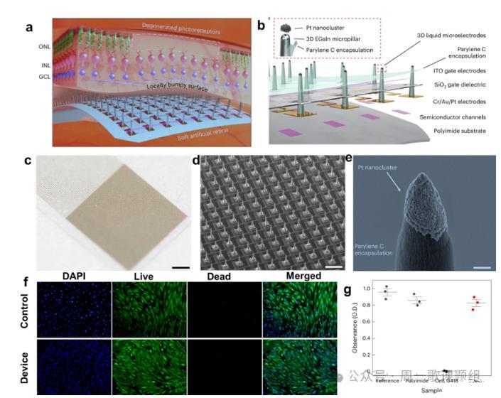 首先,作者介紹了3DLM微電極陣列軟人工視網(wǎng)膜的結(jié)構(gòu)和體內(nèi)外生物相容性。該微電極(圖1a)能夠緊鄰不均勻變性視網(wǎng)膜表面,LMs突出的柔軟柱狀探針直接刺激視網(wǎng)膜神經(jīng)節(jié)細胞(RGCs)。從該器件結(jié)構(gòu)的布局來看(圖1b),EGaln微柱陣列通過3D打印直接印刷在光電晶體管的漏電極表面上,柱子側(cè)壁被聚對二甲苯C層封裝,頂端電鍍了鉑納米團簇(鉑黑PtB)增加了微電極的納米級粗糙度和它們的電化學(xué)表面積。光電晶體管用于產(chǎn)生光電流,增大漏極電流,并在漏極電壓的脈沖刺激下,通過微電極注入RGCs的電荷顯著增加,然后在RGCs內(nèi)誘發(fā)的動作電位傳遞到視神經(jīng),從而替代視覺信息。這種人造視網(wǎng)膜結(jié)構(gòu)將高分辨率晶體管陣列和3D LM微電極集成在一起,每個微電極尖端均具有PtB涂層,且這些涂層沒有改變EGlan本身的彈性模量(圖1c-1e)。為了確保該裝置的體內(nèi)/體外生物相容性,作者使用人視網(wǎng)膜色素上皮細胞的活/死細胞進行了細胞生存能力的測試以及在植入活體rd1小鼠五周后相關(guān)免疫和神經(jīng)毒性的測試,結(jié)果表明該裝置滿足醫(yī)療器械的體外/體內(nèi)毒性標準(圖1f-1g)。