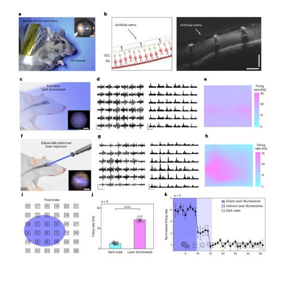 作者報道了一種柔性人造視網(wǎng)膜,具有直接打印的3D LM微電極,能夠進行微創(chuàng)視網(wǎng)膜刺激。體內(nèi)實驗表明,可見光照明誘導(dǎo)了光線入射的局部視網(wǎng)膜區(qū)域的RGCs的尖峰活動,表明活rd1小鼠具有視力恢復(fù)的潛力。這些結(jié)果對不均勻視網(wǎng)膜變性患者的個性化人工視網(wǎng)膜的開發(fā)具有預(yù)后意義。