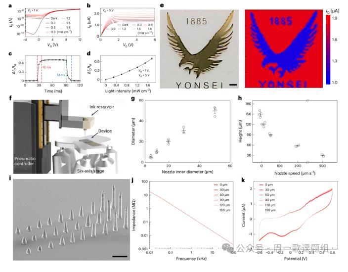 然后,作者表征了該軟性人工視網(wǎng)膜的光電及電化學(xué)特性。不同光強度照射下該設(shè)備顯示出典型的光敏場效應(yīng)晶體管行為(圖2a-2b),并且具有較快的光響應(yīng)和恢復(fù)時間(圖2c)。此外,該晶體管陣列與入射光強度呈現(xiàn)線性比例(圖2d)并且允許在光照期間觀察通過鷹形蔭罩圖案的光(圖2e)。為了得到一個柱狀3D LM微電極陣列作為刺激電極,作者使用具有高分辨率打印的3D直接打印系統(tǒng)(圖2f)。其中玻璃毛細管嘴的內(nèi)徑?jīng)Q定了EGaln柱的直徑,載物臺的縱向下降速度決定支柱的高度(圖2g-2i)。此外,循環(huán)伏安曲線表明了該器件的阻抗和電荷存儲容量不隨支柱的高度而顯著變化(圖2j-2k)。