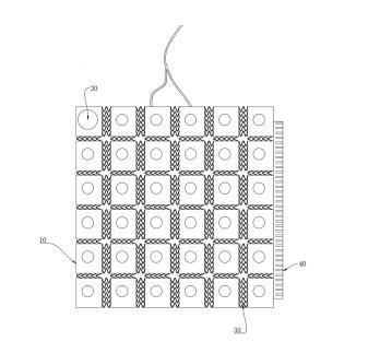 所述檢測(cè)單元10呈陣列分布,所述檢測(cè)單元10之間通過(guò)彈性部30連接,從而使得多個(gè)檢測(cè)單元10、多個(gè)彈性部30連接在一起而形成檢測(cè)主體。由于檢測(cè)單元10之間通過(guò)彈性部30進(jìn)行連接,因而使用時(shí),可通過(guò)拉伸所述彈性部30而調(diào)整檢測(cè)主體的形態(tài)以貼合在與胸廓出口綜合征相關(guān)的部位表面上進(jìn)行信號(hào)采集。這樣,便可根據(jù)實(shí)際需要而調(diào)整貼合面大小而將各個(gè)檢測(cè)單元10設(shè)置在準(zhǔn)確的位置上進(jìn)行檢測(cè),從而提高數(shù)據(jù)采集的準(zhǔn)確性。