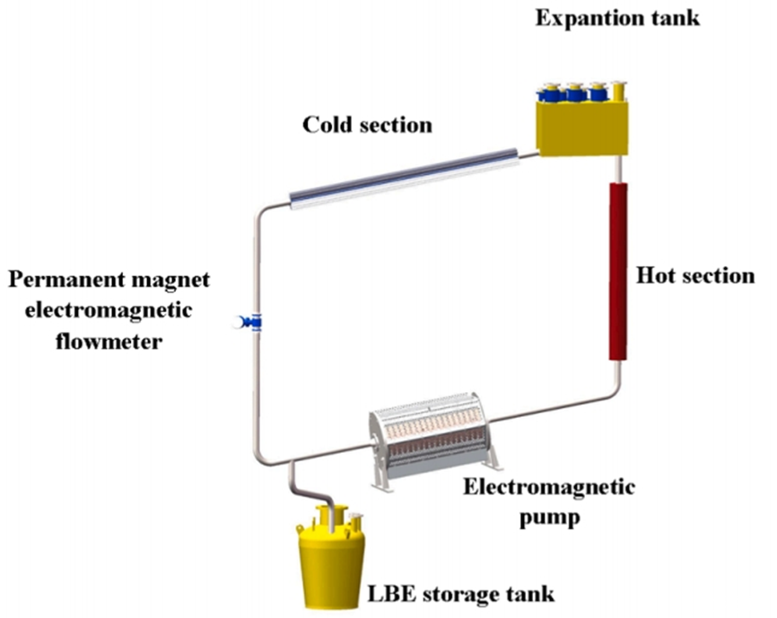 試驗設備為強制循環回路,稱為UPBEAT回路。UPBEAT回路用于進行氧氣控制,材料和熱工實驗。管道和容器的材料都是316L不銹鋼鋼。設備主要包括LBE儲罐、電磁泵、永磁電磁流量計和膨脹罐。回路管上設置有熱段加熱器和冷段散熱器,如圖2所示。