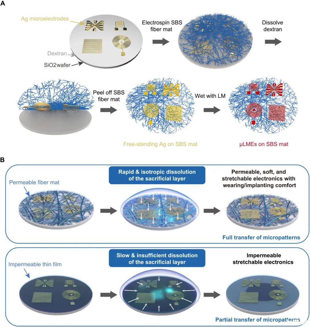 圖1A顯示了晶圓級μLME的制造過程示意圖,該過程包括四個主要步驟:(i)在SiO上對Ag進行光刻2用一層薄薄的水溶性葡聚糖預改性晶圓;(ii)將纖維聚(苯乙烯嵌段-丁二烯-嵌段-苯乙烯)(SBS)氈靜電紡絲到Ag微圖案上;(iii)葡聚糖層的溶解和銀微圖案從SiO轉移2將晶圓鋪在SBS光纖氈上;(iv)在Ag覆蓋區域選擇性潤濕LM以產生μLME。