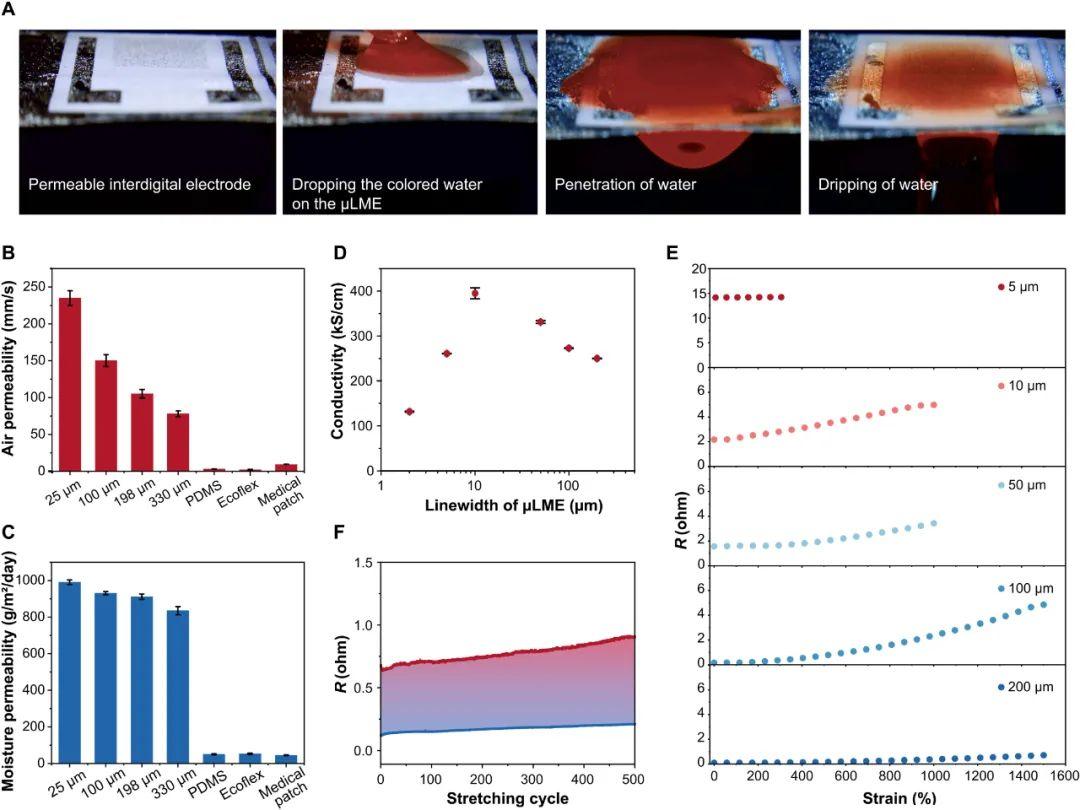 在大尺寸、可滲透和可拉伸的纖維氈上成功制備μLMEs,為高密度、集成、可植入和長期生物相容的LM電子器件鋪平了道路。目前,μLMEs通過配備實驗室的光刻技術顯示出2μm的典型圖案化分辨率,透濕率為990 g/m2每天,設備密度超過75,000個電極/厘米2,電導率約為105S/cm,拉伸性高達1500%的應變。原則上,μLME的圖案化分辨率可以進一步提高到亞微米(0.25至1μm)區域,例如,通過使用高分辨率光刻工具和較小纖維直徑的纖維氈。