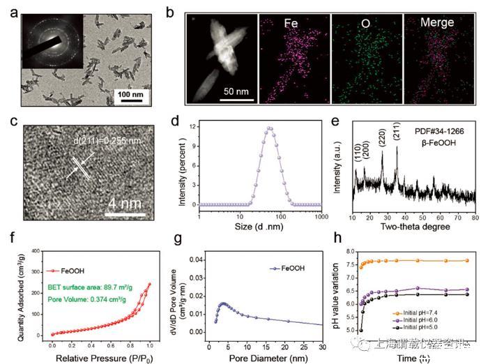 圖1、介孔FeOOH納米紡錘體(NSs)的合成與表征。a)TEM圖像和b)FeOOH NSs的元素映射模式。插圖顯示了相應(yīng)的選定區(qū)域電子衍射圖。c)結(jié)晶FeOOH NSs的TEM圖像。d)FeOOH NSs在水溶液中的動(dòng)態(tài)光散射數(shù)據(jù)。e)FeOOH NSs的XRD圖譜。f)PEG修飾的FeOOH NSs(縮寫(xiě)為FeOOH NSs)的N 2吸附/解吸等溫線。g)改性的FeOOH NSs在N 2吸附/解吸等溫線中的孔徑分布。h)加入改性的FeOOH NSs后,不同溶液(pH=5.0、6.0或7.4)的pH變化。圖1、介孔FeOOH納米紡錘體(NSs)的合成與表征。a)TEM圖像和b)FeOOH NSs的元素映射模式。插圖顯示了相應(yīng)的選定區(qū)域電子衍射圖。c)結(jié)晶FeOOH NSs的TEM圖像。d)FeOOH NSs在水溶液中的動(dòng)態(tài)光散射數(shù)據(jù)。e)FeOOH NSs的XRD圖譜。f)PEG修飾的FeOOH NSs(縮寫(xiě)為FeOOH NSs)的N 2吸附/解吸等溫線。g)改性的FeOOH NSs在N 2吸附/解吸等溫線中的孔徑分布。h)加入改性的FeOOH NSs后,不同溶液(pH=5.0、6.0或7.4)的pH變化。