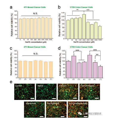 圖2、4T1細(xì)胞和CT26細(xì)胞的體外細(xì)胞活力測(cè)定。a,b)在一系列濃度(0–1000×10-6 m)的NaHS孵育24小時(shí)后,4T1細(xì)胞和CT26細(xì)胞的相對(duì)細(xì)胞活力。c,d)用不同處理的4T1和CT26細(xì)胞的細(xì)胞生存力:1)PBS;2)NaHS;3)FeOOH;4)NaHS+FeOOH;5)NaHS+NIR;6)FeOOH+近紅外;7)NaHS+FeOOH+NIR。將細(xì)胞處理組用808nm NIR激光照射5分鐘,照射密度為1.5Wcm-2。所有經(jīng)NaHS處理的組的濃度均設(shè)置為200×10-6 M)各種處理(Bar=50μm)后,用活/死試劑盒染色的CT26細(xì)胞的熒光圖像。