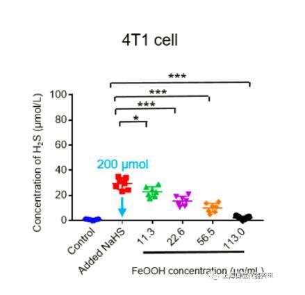 圖4、應(yīng)用unisense硫化氫微電極測(cè)試4T1細(xì)胞裂解過(guò)程中溶解的硫化氫濃度。從4T1細(xì)胞中提取的H2S濃度分別用不同處理孵育:對(duì)照組、NaHS(200°M)和NaHS加一系列FeOOH NSs濃度。