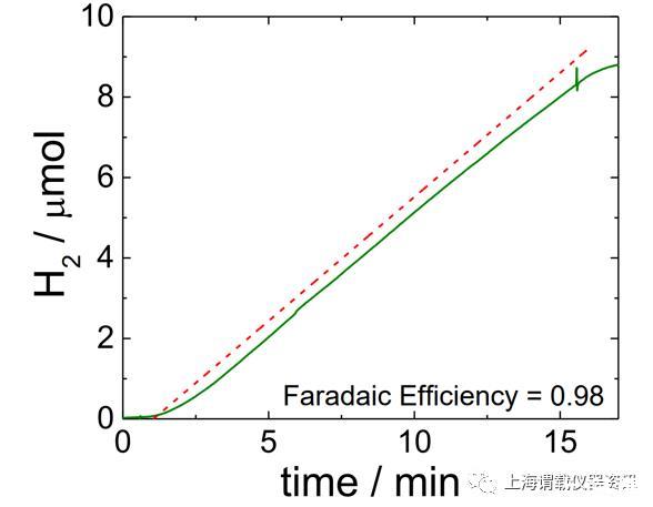 圖3、用NiMo-(a)在1 M NaOH中測定HER的代表性法拉第效率。測量在圖1所示的雙室體電解池裝置中進行,沒有頂空,所有氣體產(chǎn)品溶解在溶液中。在0.195 cm2的圓盤電極上以10 mA cm-2電流密度保持30分鐘。假設(shè)100%法拉第效率,從通過的電荷量(1.755 C)中預(yù)期的H2量顯示為一條紅色虛線。Unisense H2-500微電極檢測到的氫氣量顯示為實綠色線。本實驗測定的法拉第效率為ε=1.0。