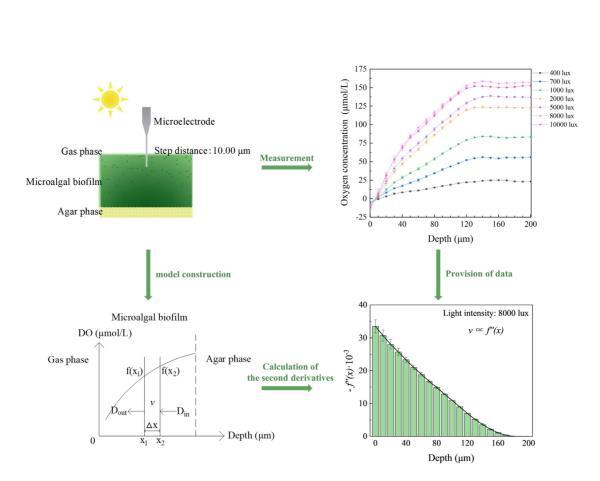 DO微電極和擴散反應模型的結合已被用于估算生物膜或活性污泥顆粒內氧濃度的變化,使用微電極監測SBBR生物膜中的DO水平,并計算了細菌生物膜的氧擴散效率。它顯示了與水膜中的線性分布不同的不同指數下降趨勢,使用光學DO探針研究了刺激池中的氧分布,并發現池的頂部13厘米深度的氧產量占Spirulina總氧產量的90%。根據直接測量氧微型輪廓來評估光生物膜反應器中微藻生物膜中的光合作用。在現場規模的實驗中,生物膜表面附近的光照部分的氧濃度約為污水中測得的三倍。先前關于氧分布和光合速率的研究已在一些生物膜或顆粒污泥中進行。然而,缺乏在微藻生物膜不同深度量化光合速率的方法。在本研究中,使用微電極測量了不同光強下微藻生物膜內不同深度的DO濃度,并建立了一個描述生物膜深度沿光合速率變化的模型,以揭示光對微藻生物膜生長的調節機制。