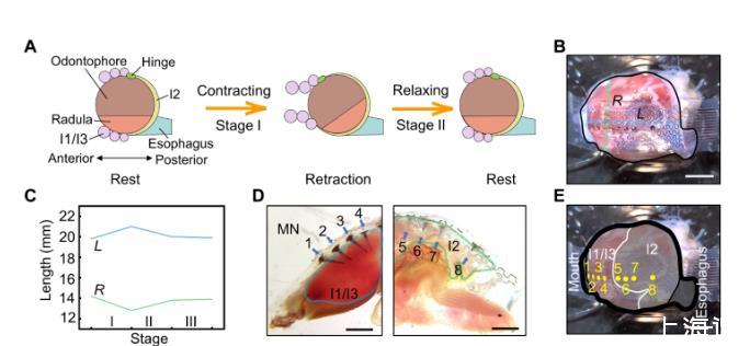 微針的大伸縮性和相對(duì)較高的模量使SMNEA平臺(tái)非常適合記錄動(dòng)態(tài)運(yùn)動(dòng)組織內(nèi)的電生理信號(hào),如肌肉內(nèi)肌電圖。海洋軟體動(dòng)物Aplysia californica的頰腫塊是一個(gè)模型,其中包含負(fù)責(zé)進(jìn)食、咬合和吞咽的不同肌肉群的密集組合。本研究演示了如何應(yīng)用SMNEA從孤立、動(dòng)態(tài)的Plysia頰塊感測(cè)肌肉內(nèi)肌電圖。I1/I3和I2肌肉群以及一個(gè)被動(dòng)鉸鏈?zhǔn)穷a塊的主要組成部分,它們共同作用壓縮橈骨/齒突(齒狀舌和移動(dòng)齒狀舌的肌肉)以進(jìn)行進(jìn)食。在圖5A所示的回縮周期中,I2肌肉放松,I1/I3肌肉收縮,將橈骨/噬齒肌向后推。結(jié)果,橈骨表面向后旋轉(zhuǎn),接近食道入口。之后,當(dāng)I1/I3和I2肌肉全部松弛時(shí),橈骨/頜骨旋轉(zhuǎn)回原來(lái)的位置,頰面恢復(fù)到靜止?fàn)顟B(tài)。