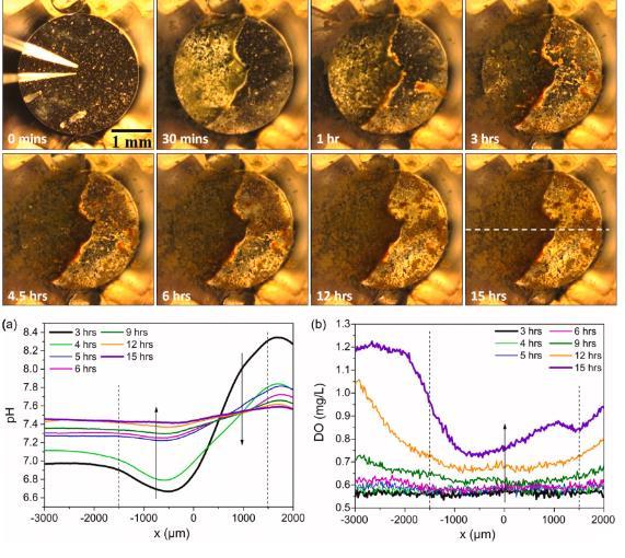圖3、指定浸泡時間后HBSS中FeMnAg的視覺外觀和線掃描(a)局部pH值和(b)樣品表面上的DO濃度。白色虛線顯示線掃描的位置。黑色虛線表示樣品位置。在第一張光學顯微照片中可以看到用于測量的pH和O 2微探針。從圖中可以看出FeMnAg表面上明顯的酸化和堿化位點反映在與光學圖像中腐蝕外觀相關的pH線掃描上。隨著浸泡時間的增加,由于腐蝕產物的大量覆蓋,酸化和堿化作用逐漸減弱,同時阻礙了氧的擴散,強耗氧量逐漸減少。