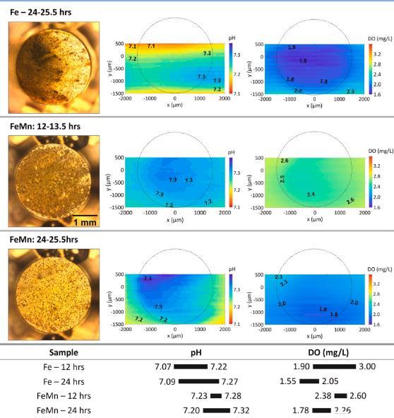 圖4、Fe和FeMn在HBSS中浸泡12和24小時后的視覺外觀、局部pH分布和溶解氧濃度分布。以下部分總結了pH和DO的變化范圍。從純Fe的光學圖像中可以看出,從左側表面開始產生明亮的腐蝕產物變暗,耗氧量增加:DO濃度值(1.90-3.00)低于(2.40-4.10)。與純Fe(7.07-7.09)相比,FeMn(7.20-7.23)的最低pH值略高,表明在HBSS中FeMn的降解過程中溶解鐵物質的水解受到輕微抑制。DO濃度的最小值從12小時到24小時持續下降(2.38-1.78),同時局部pH值略有增加(7.23-7.28到7.20-7.32)。