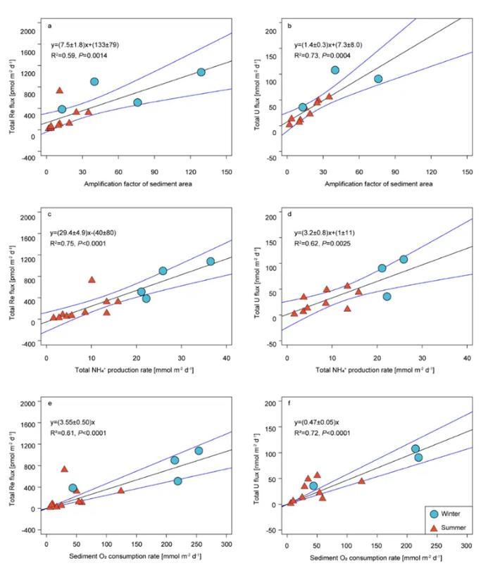 圖1.陸架沉積物Re和U通量與沉積物浸灌作用系數(a, b)、有機碳厭氧分解速率(c、d)和沉積物耗氧速率(e , f)的相關性