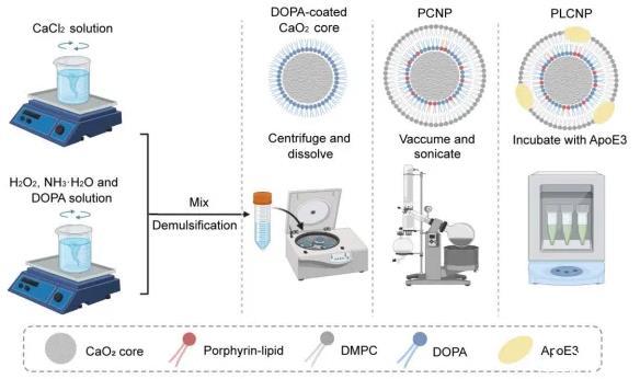 多形性膠質母細胞瘤(GBM)患者預后不佳的主要原因是手術干預后殘留的高度侵襲性腫瘤。精確術中成像和術后殘余清除技術的發展將有助于GBM的完全消除。在這里,上海交通大學醫學院藥理與化學生物學系高小玲教授和鄭剛教授合作開發了一種自分解卟啉脂蛋白包被的過氧化鈣納米顆粒(PLCNP),通過巨噬細胞作用靶向GBM,允許熒光引導的GBM手術,并通過減輕缺氧來改善GBM殘留的光動力治療(PDT)。通過減少自猝滅和提高溶酶體逃逸效率,過氧化鈣(CaO2)核在PLCNP中的摻入放大了卟啉脂質的熒光強度。此外,CaO2核心減少了腫瘤缺氧,提高了PLCNP的PDT療效,實現了低劑量的PDT,逆轉了PDT后缺氧加重引起的腫瘤進展。